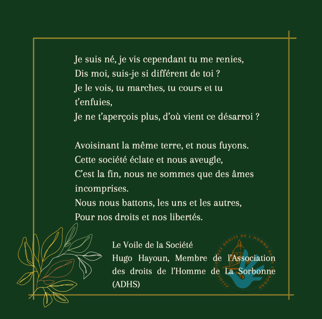 Le pôle culturel innove cette année en donnant la parole à ses membres : des projets plus personnels sont mis en avant comme ce premier poème de notre membre Hugo Hayoun.