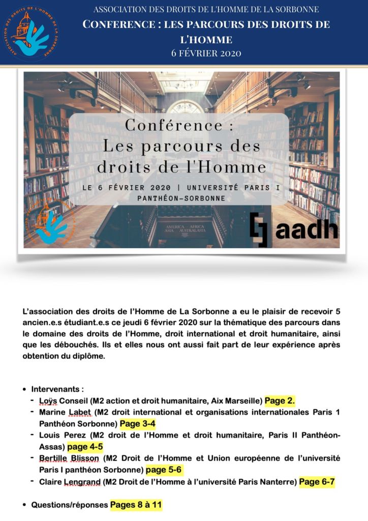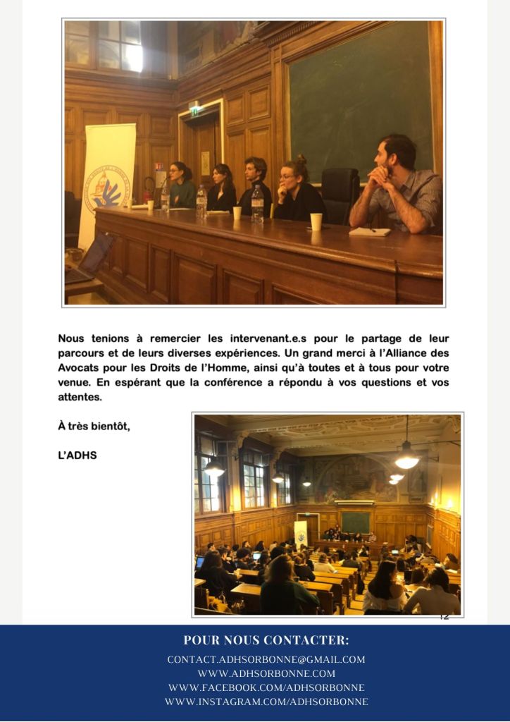 L’Association des Droits de l’Homme de la Sorbonne a eu le plaisir d’organiser une conférence sur les parcours des droits de l’Homme, en partenariat avec l’Alliance des Avocats pour les Droits de l’Homme.