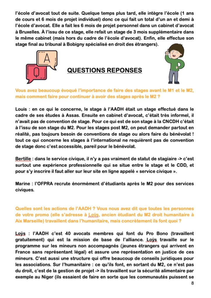 Par ailleurs, cette conférence devait être suivie d’une autre sur « Les métiers des droits de l’Homme ». Cette seconde conférence aurait eu pour objectif de présenter différentes carrières dans le domaine des droits de l’Homme. Nous aurions dû recevoir différents professionnels qui nous auraient présenté leurs parcours. Malheureusement, cette seconde conférence n’a pas pu avoir lieu à cause de la pandémie.