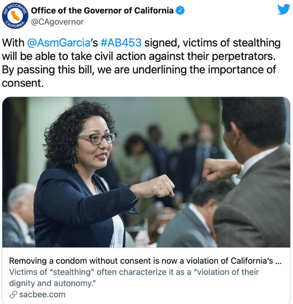 En réaction à cette étude, aux États-Unis, le gouverneur californien, Gavin Newsom a signé ce jeudi 7 octobre 2021, un projet de loi bipartisan qui interdit le retrait non consenti de préservatif. La nouvelle législation ajoute cet acte à la définition civile des violences sexuelles, faisant de la Californie le premier État américain à rendre le stealthing illégal.