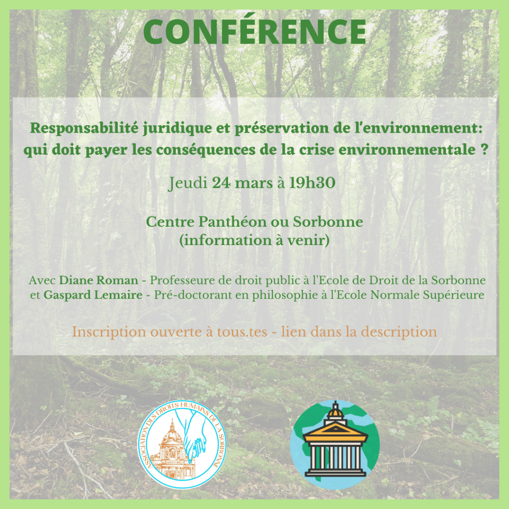 L’Association des Droits Humains de la Sorbonne et Planète Sorbonne ont le plaisir de vous annoncer que jeudi 24 mars à 19h30 se déroulera une conférence sur le thème »Responsabilité juridique et préservation de l’environnement : qui doit payer les conséquences de la crise environnementale? ».